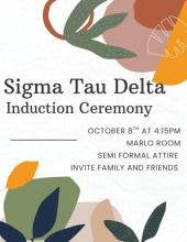 Sigma Tau Delta Induction Ceremony will be held at 4:15 on October 8th in the Marlo Room. Attire will be semi formal. Please join us and bring friends and family.