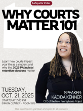 Kadida Kenner, CEO of the New Pennsylvania Project, will give a non-partisan presentation, "Why Courts Matter 101." Explore how to make your voice heard as a student, how court rulings affect students’ lives, and what’s at stake in the 2025 judicial retention elections in Pennsylvania.