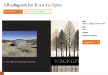 Jim Toia will read from a book on his art, Jim Toia: Notes on Threatened Landscapes, forthcoming from the Zimmerli Museum Rutgers Press. This publication reflects upon his innovative work with natural materials and his responsiveness to our living environment. His work has been exhibited widely in the United States as well as in Europe and Asia and is featured in collections at Stanford University, the Yale Museum of Art, the Dallas Museum, and other prominent museums. He is the Director of Community Based Teaching at Lafayette College, where he teaches in the Art Department, and the Executive Director of the Karl Stirner Arts Trail.