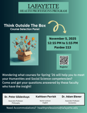 Our panelists will be Professors Adam Biener (Economics), Kathleen Parrish (English), and Peter Guildenhuys (Philosophy). They will be talking about courses that will help you meet your Humanities and Social Science competency, enrich your health professions school application, as well as reflect your liberal arts learning. Register Here.