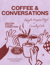 The Counseling Center and Lafayette Happiness Project have teamed up to provide students a space to create new connections over coffee, tea, snacks, etc. Come join us as we learn more about what it means to connect with others and provide a space to talk with one another.