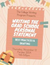 Join the College Writing Program for a workshop about grad school personal statement best practices. There will also be time to work on your personal statement draft(s). This event is open to folks who are currently applying to graduate school or just interested in learning more about the process!