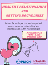 The Lafayette College Counseling Center invites you to an interactive workshop on Healthy Connections & Setting Boundaries. We will explore the importance of connection, why boundaries matter and deepen awareness of our own. This is an opportunity to engage in reflection, learn helpful tips to navigate boundaries and learn about campus resources to support your growth. The workshop will be held on Thursday November 13th at 4:15pm to 5pm in Oechsle Hall Room 223.