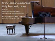 Join Kirk and Holly for an afternoon of virtuosic music for saxophone and piano. The program begins with William Albright's Sonata for Alto Saxophone and piano--a large-scale work built from an exploration of musical styles that range from atonal to minimalist to Be-bop. The duo will perform two of Kirk O'Riordan's recent compositions: Prayer Stones (O'Riordan's adaptation of his work for viola and piano that appears on his Autumn WInds CD) and Variations on a Ground Bass. Both works will recieve their Lafayette premiers.