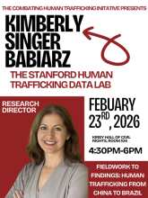 Join us for an evening lecture with a the Director of Research, Kimbery Babiarz, from the Stanford Human Trafficking Data Lab whose work examines human trafficking across global contexts. Her research focuses on human trafficking in China and Southeast Asia, and she currently applies quantitative methods to study labor trafficking and child labor in Brazil.