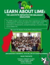 The Lafayette Initiative for Malagasy Education (LIME) program is an annual educational interim trip to Madagascar that connects inspiring, fun, and outgoing Lafayette students with a public school in Antananarivo to teach high-school-level English and mathematics. The most recent LIME group, LIME 16, will present on their trip and describe to the school what they've learned and what they took away from it.