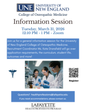 Join us for a general information session for the University of New England College of Osteopathic Medicine. Recruitment Coordinator Ms. Kate Dransfield will go over application requirements, the curriculum, student life, outcomes and more! Register here.