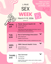 Learn from a panel of healthcare providers about what to expect at your first sexual health appointment, medical advocacy, and building healthy habits! LRAJE moderators will have questions prepared and will also respond to anonymous send-ins (see link in Instagram bio to submit a question, @lraje_laf). This event will kick of LRAJE's "Sex Week."