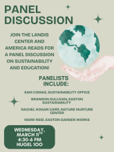 Join the Landis Center and America Reads on March 11th from 4:30 pm to 6 pm in Hugel 100, for a panel discussion about sustainability and education. Local leaders will talk about how we can bring sustainability into schools and our community.