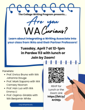 Are you teaching a W-course now or in the near future? Are you wondering how WAs are incorporated into classes like yours (or how they could be?). Learn about integrating a Writing Associate into your class from WAs and their Partner Professors! This event will feature a panel of WAs and their Partner Professors with time for Q & A. RSVP for Lunch or the Zoom Link: https://bit.ly/4rOSIjs.