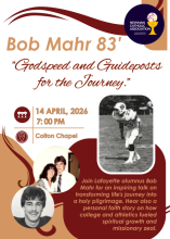 Join Lafayette alumnus Bob Mahr for an inspiring talk on transforming life's journey into a holy pilgrimage, marked by faith, prayer, and preparation. Learn practical guideposts to navigate challenges with hope, drawing from the Church's wisdom that every moment counts. Hear also a personal faith story on how being a college student at Lafayette and a student athlete (football player) fueled spiritual growth and missionary zeal.