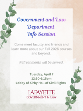 12:30-1:15pm Meet-and-greet witih Department faculty for all current and prospective Government and Law majors and minors [Lobby of Kirby Hall of Civil Rights]