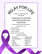Relay for Life brings everyone together as a community to celebrate survivors, remember loved ones, and fight back against cancer. Come support SMAC and help raise funds for the American Cancer Society! Fun activities, food truck, and raffle prizes provided!!